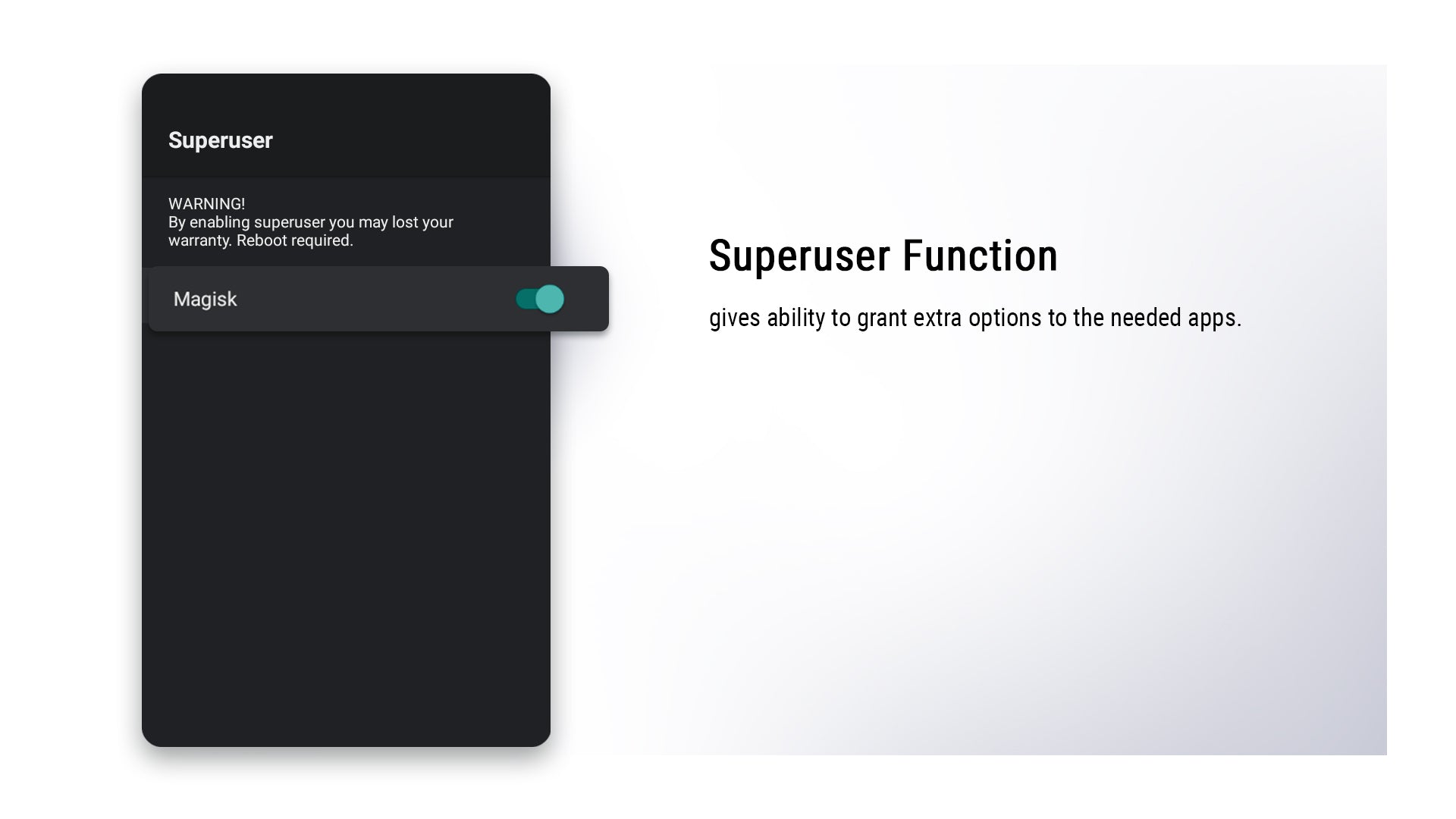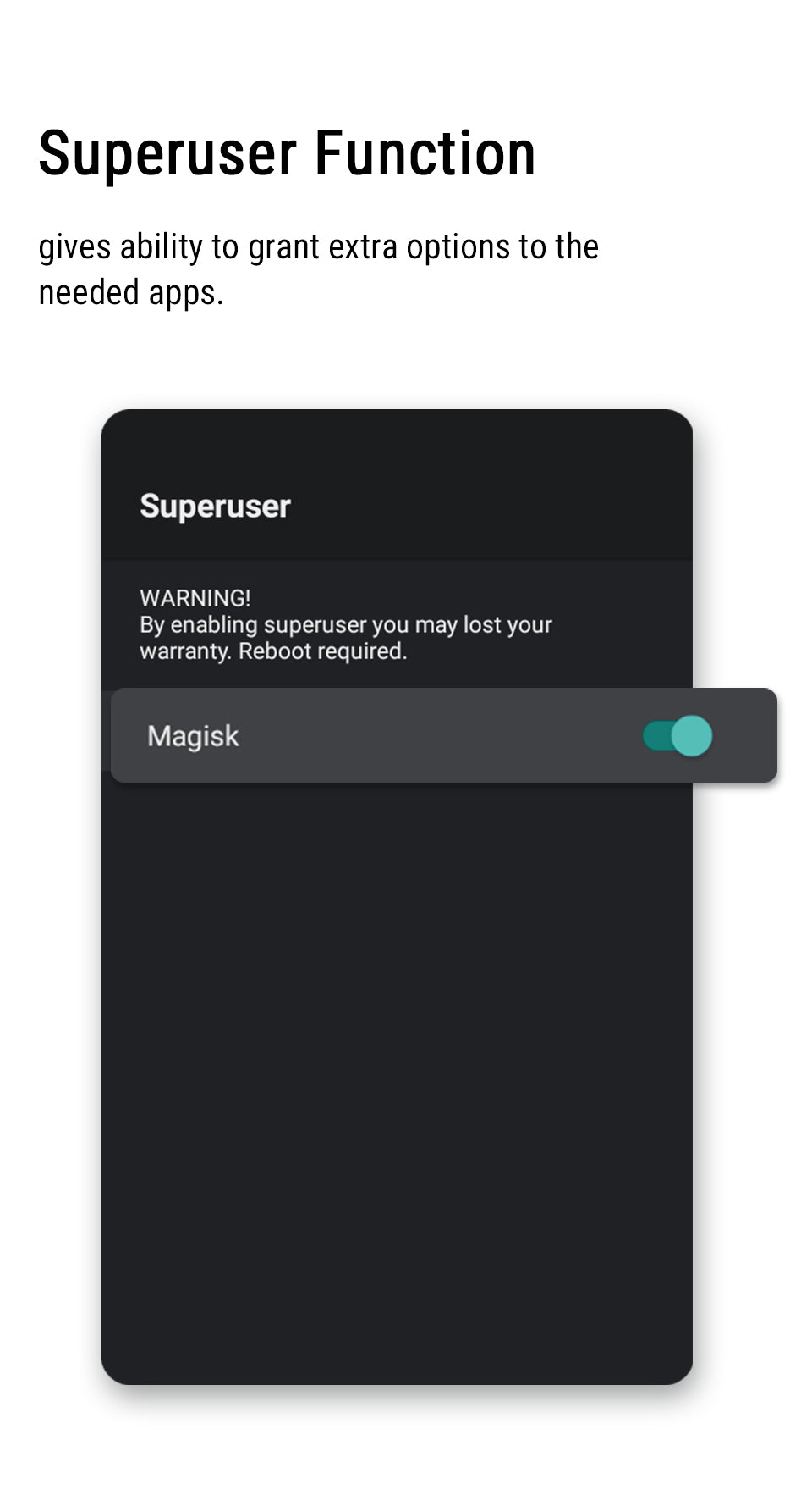 • Root Access: Enhanced flexibility for users via Root Access Toggle: Seamlessly turn root access on/off without flashing methods. Options include Silent Root (automatic) and SuperSU-style (interactive).