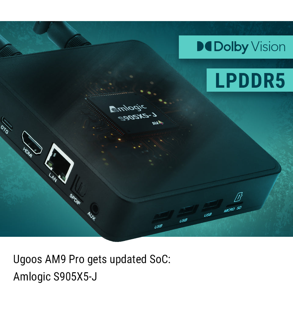 The UGOOS AM9 PRO is the upgraded variant of the now discontinued AM9. It has upgraded LPDDR5 RAM instead of DDR and it adds Dolby Vision.