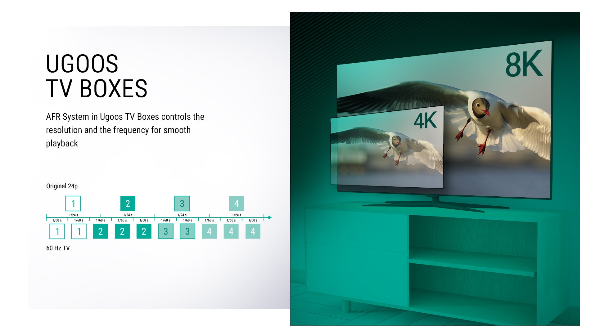 • [Android 11 and AV1] Ugoos SK1 works under Android Red Velvet Cake OS, supports AV1 Coding Format. AFR system in Ugoos tv boxes controls the resolution and the frequency for smooth playback
